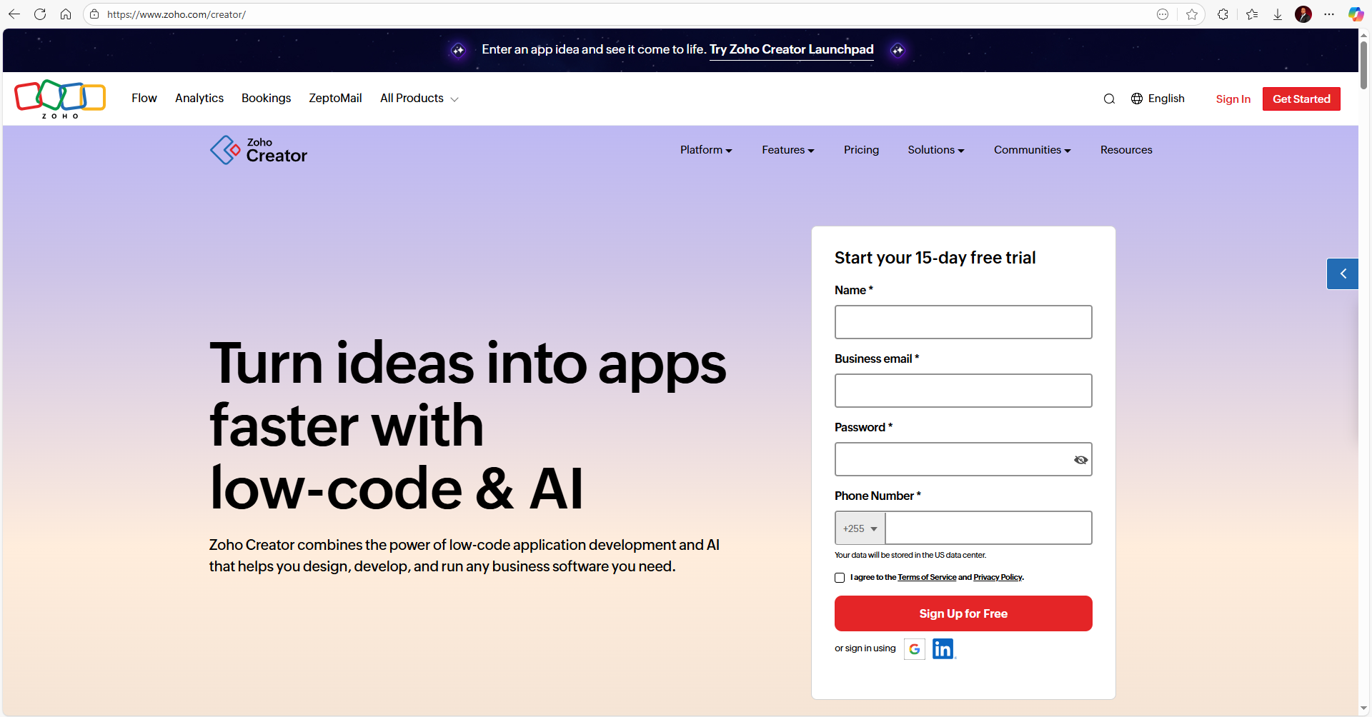 You will see a Google sign-in icon that you can use to create an account on Zoho Creator platform. Click the google icon